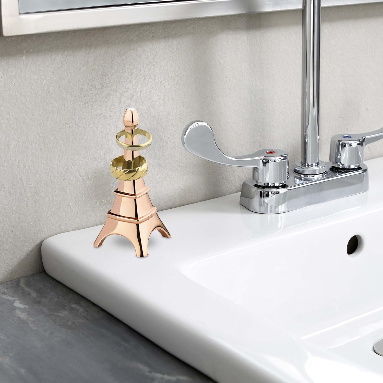 White kitchen sink faucet with tall necklace bust display stand.